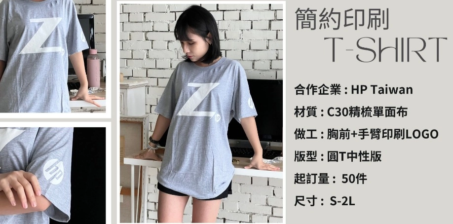 產品編號 : SG020 合作企業 : HP Taiwan 款式 : 圓T 材質 : C30精梳單面布 做工 : 胸前+手臂印刷LOGO 版型 : 圓T中性版 基本起訂量 : 50件 尺寸規格 : S-2L(尺寸問題請洽客服)