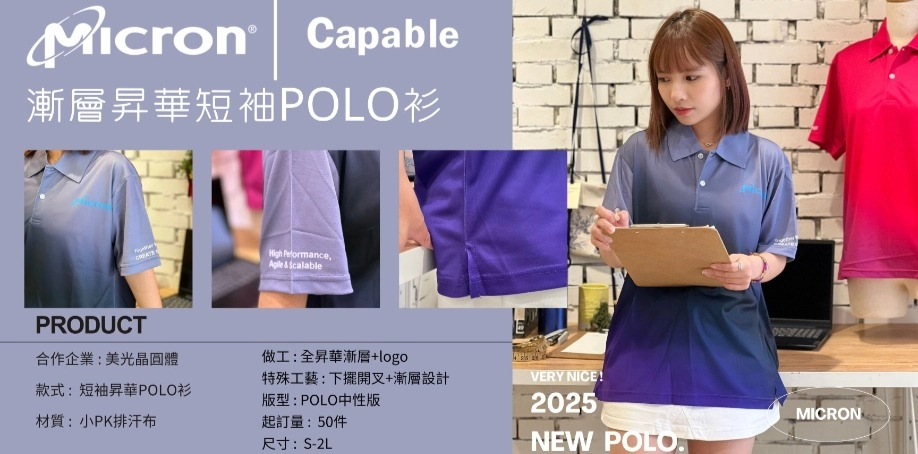 產品編號 : SC055 合作企業 : MICRON美光 款式 : 短袖POLO衫 材質 : 小PK排汗布 做工 : 全昇華漸層配色 版型 : POLO中性版 基本起訂量 : 50件 尺寸規格 : S-2L(尺寸問題請洽客服)
