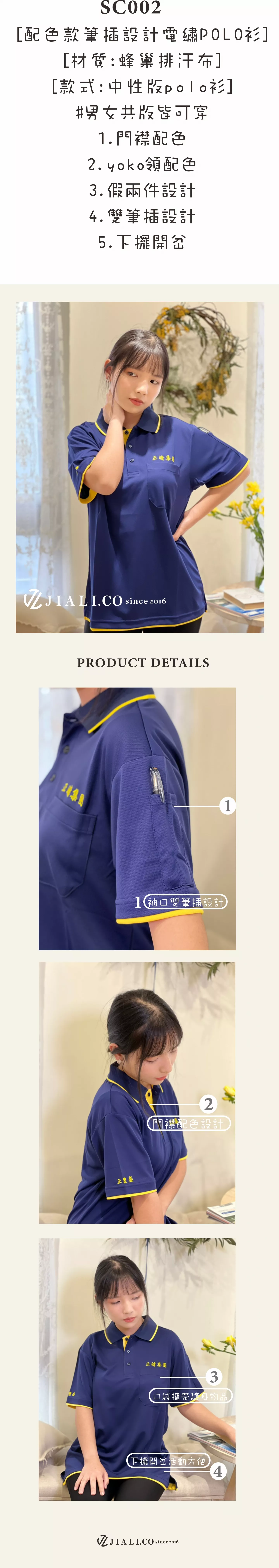 產品編號 : SC002 合作企業 : 正晴集團 款式 : 中性版POLO衫 材質 : 蜂巢排汗布 做工 : 假兩件設計+電繡LOGO 特殊工藝 : 下擺開岔+筆插設計 版型 : 中性版POLO衫 基本起訂量 : 50件 尺寸規格 : S-2L(尺寸問題請洽客服)