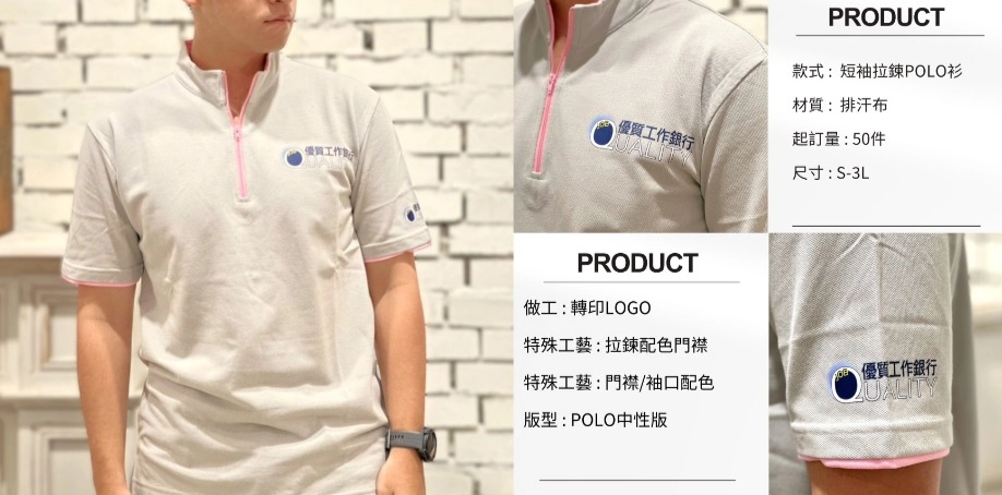 產品編號 : SC041 合作企業 : 優質工作銀行 款式 : 短袖拉鍊POLO衫 材質 : 排汗布 做工 : 轉印兩處LOGO 特殊工藝 : 拉鍊配色門襟 版型 : POLO中性版 基本起訂量 : 50件 尺寸規格 : S-2L(尺寸問題請洽客服)