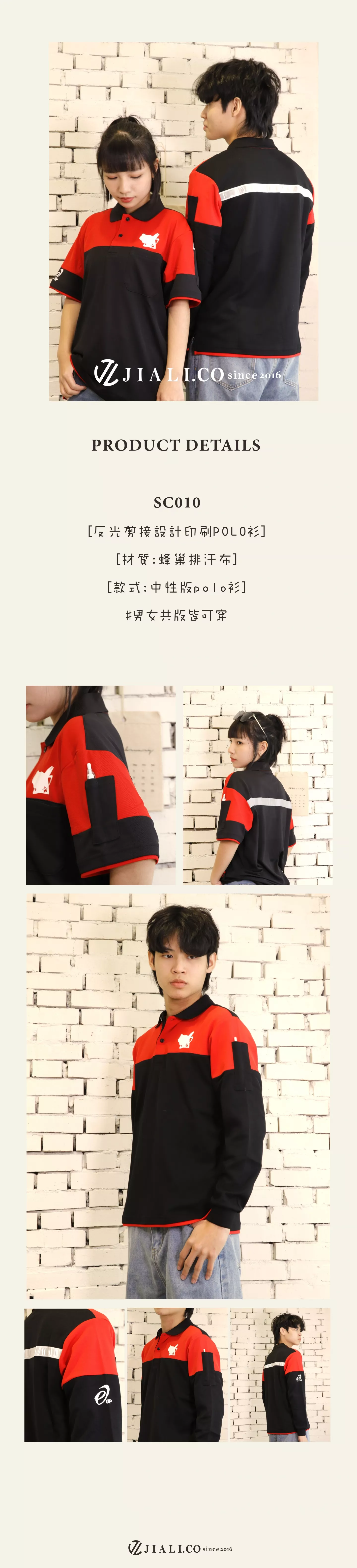 產品編號 : SC010 布料材質 : TOP抗UV速乾排汗布 衣服款式 : 假兩件式POLO衫 產品特色 : 款式採用假兩件式做法,袖子上搭配筆插的空間,讓工作流程更加順暢。後背車縫的反光塑膠片不單單是為了安全而存在,反而讓制服的整體更加精神!下擺的開叉設計不論男女穿著都有修身效果,讓制服不再是規矩的設計,而是富有時尚在內阿! 起訂量 : 歡迎來電洽詢